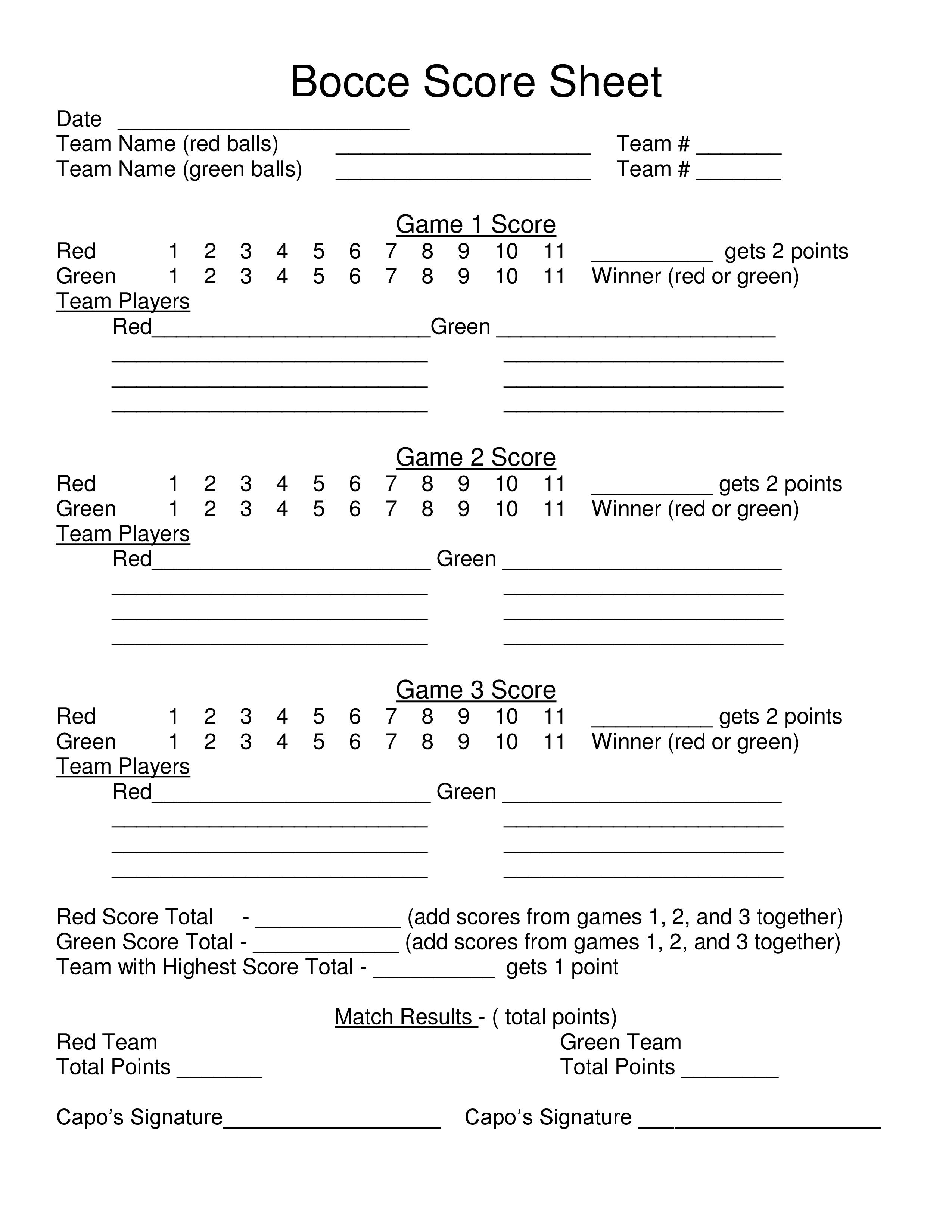 Bocce Score Sheet